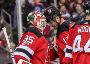 Devils center Brian Boyle (11) celebrates with goalie Cory Schneider