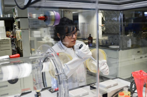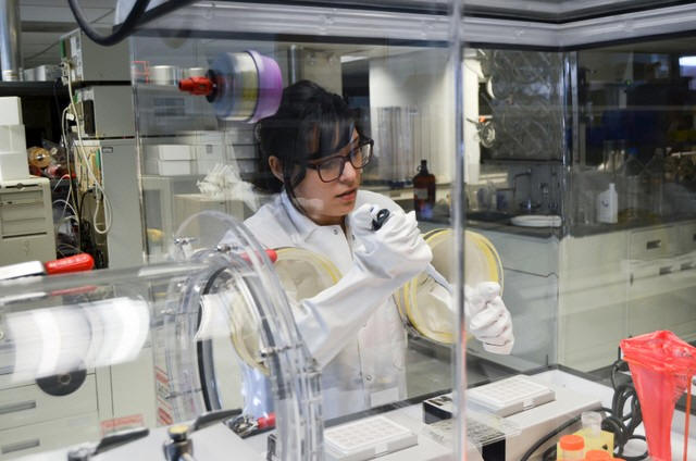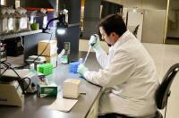 Athersys scientist pipettes sample for analysis in this handout