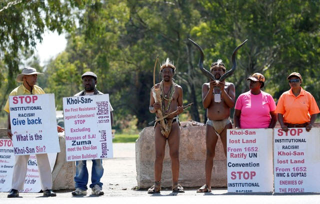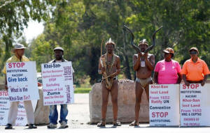 KhoiSan activists stand next to placards outside the venue of the