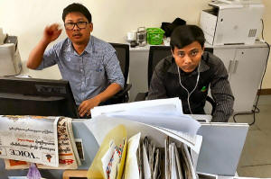 Myanmar, pose for a picture at the Reuters office in Yangon, Myanmar