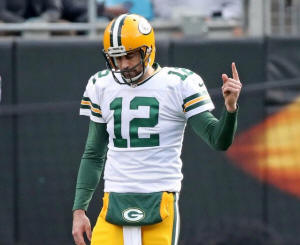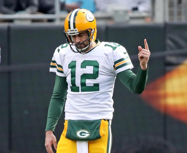 Packers quarterback Aaron Rodgers (12) reacts after throwing an
