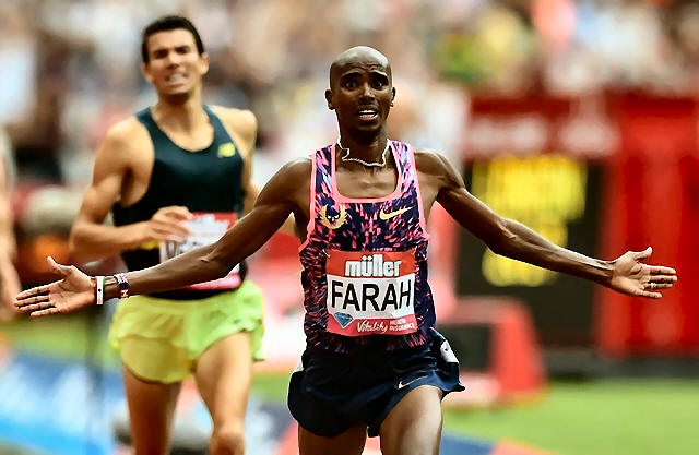 Great Britain's Mo Farah celebrates winning the Men's 3000m