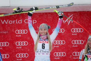 Lindsey Vonn of the U.S. celebrates after winning the Women's Super