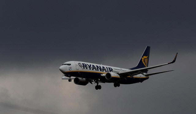 A Ryanair plane prepares to land at Manchester Airport in Manchester