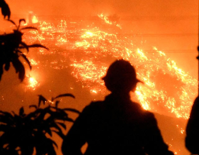 Firefighters keep a close watch on the Thomas wildfire in the hills