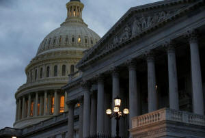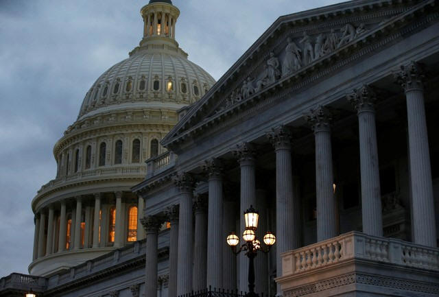 The U.S. Capitol building is lit at dusk ahead of planned votes on