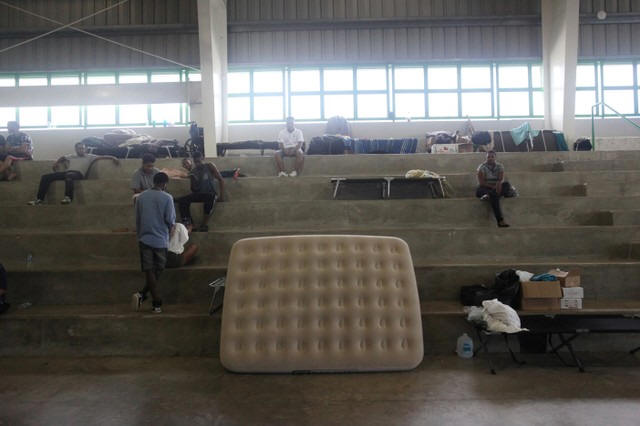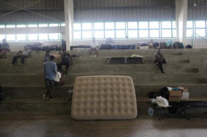 at a gymnasium of a school turned shelter during a visit of former