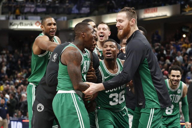 Celtics guard Terry Rozier (12) celebrates with teammates after