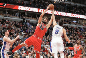 Bulls center Robin Lopez (42) is fouled by Philadelphia 76ers