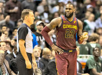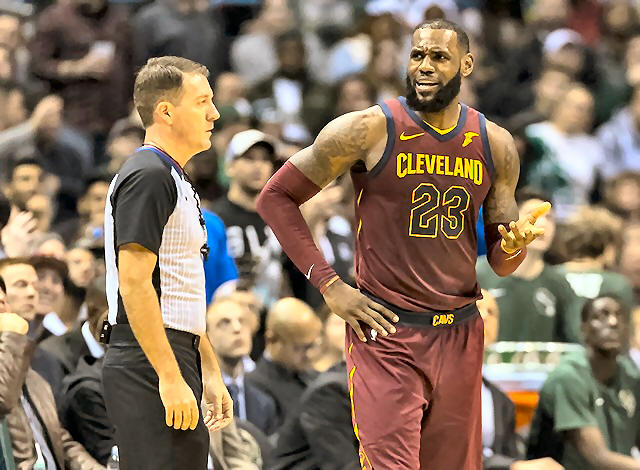 Cavaliers forward LeBron James (23) argues a call with an