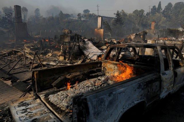 A home's remains are seen, next to a burnt out truck, after they