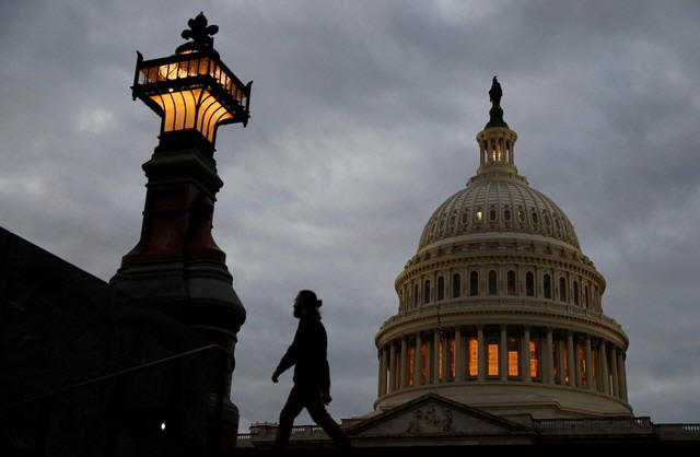 The U.S. Capitol building is lit at dusk ahead of planned votes on