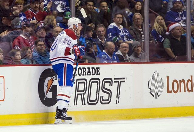 Canadiens left wing Nicolas Deslauriers (20) celebrates his first