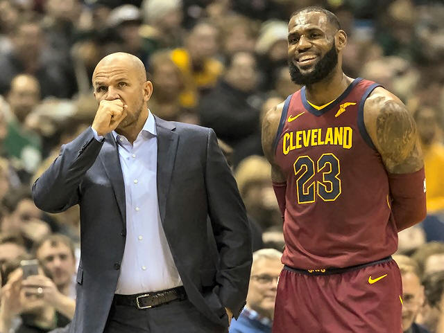 Bucks head coach Jason Kidd talks with Cleveland Cavaliers forward