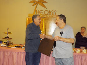 Dale Basso also came forward with a gift for Dalpoas. Basso said he had taken it upon himself to purchase a wall hanging for Dalpoas retirement. He read the inscription. “Presented to Dominic Dalpoas in appreciation of your dedication, generosity, graciousness, above all others have made the Oasis what it is today. Thank you for a job well done.”