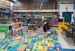 store's Play Lab, which is a cordoned off foam mat, scattered with toys and a