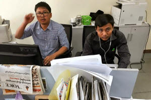 Myanmar, pose for a picture at the Reuters office in Yangon, Myanmar