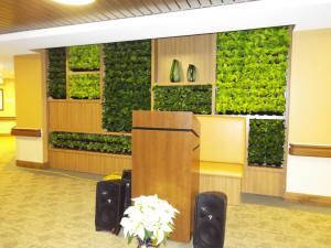 Scattered throughout the building are wonderful living plant walls such as this one that is part of the main entry. Overhead the plants are filtered sky lights that glow down on the plants in the day time and provide them with the light they need to thrive.