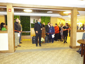 At the moment, residents are not yet living in the new building, but are scheduled to be arriving after the first of the year. The current home of those residents is located on Fifth Street and is in a building that was originally the St Clara’s Hospital. The old building featured a two story construction with a basement, and was designed with double occupancy rooms. On Thursday evening, as guests toured the new facility, many comments were heard about the bright airy feeling of the building, the use of real windows in certain activity and therapy rooms and the wonderfully comfortable feeling of the many common areas within the building. All these assets were noted as in stark contrast to the soon to be former facility.