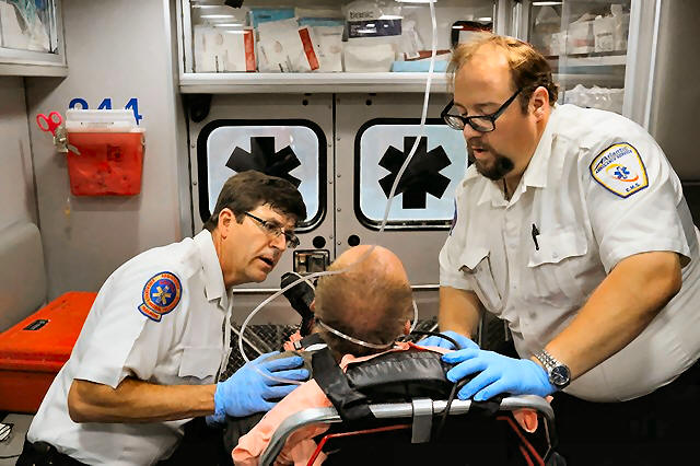 Cataldo Ambulance medics John Gardner (L) and David Farmer care for