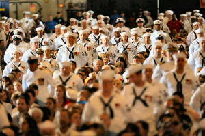 U.S. Navy sailors stand in the audience as President Donald Trump