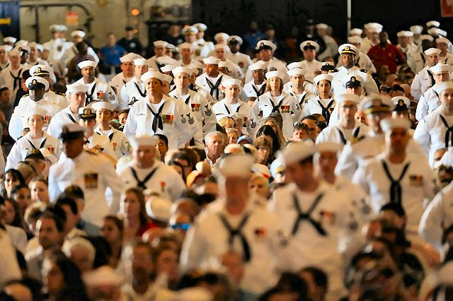 participates in the commissioning ceremony of the aircraft carrier