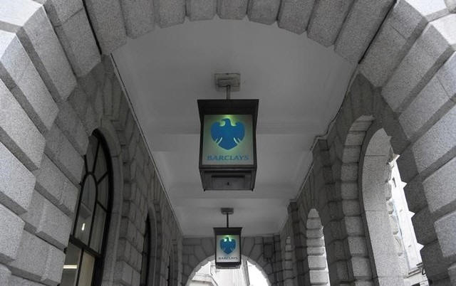 The logo of Barclays bank is seen on glass lamps outside of a branch