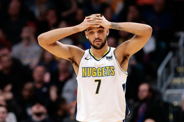 Nuggets forward Trey Lyles (7) reacts after a play in the fourth