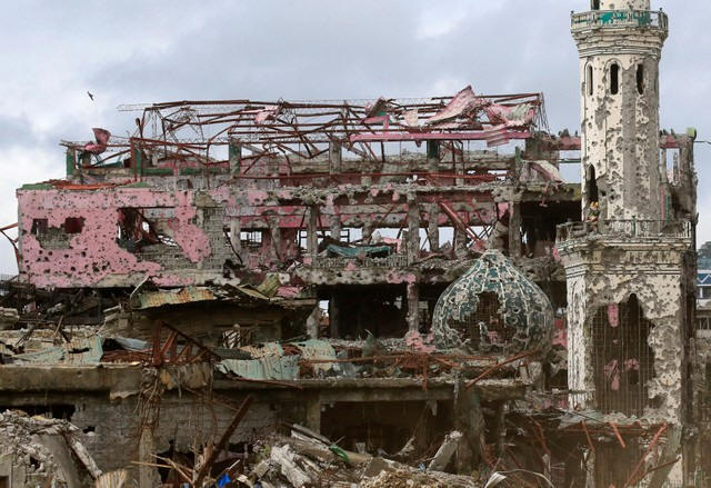 Damaged houses, buildings and a mosque are seen inside Marawi city,