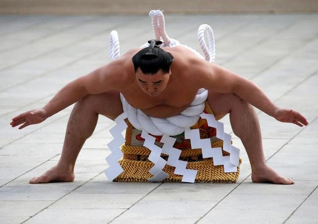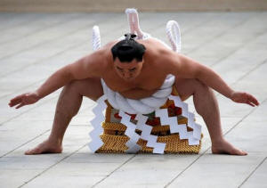 Mongolian-born grand sumo champion Yokozuna Harumafuji performs the