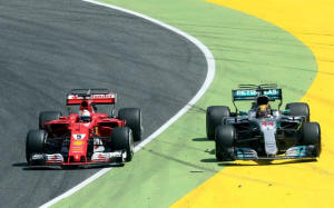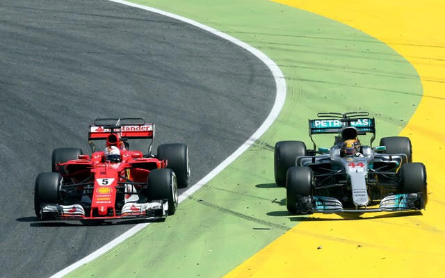 Mercedes' Lewis Hamilton tries to overtake Ferrari's Sebastian