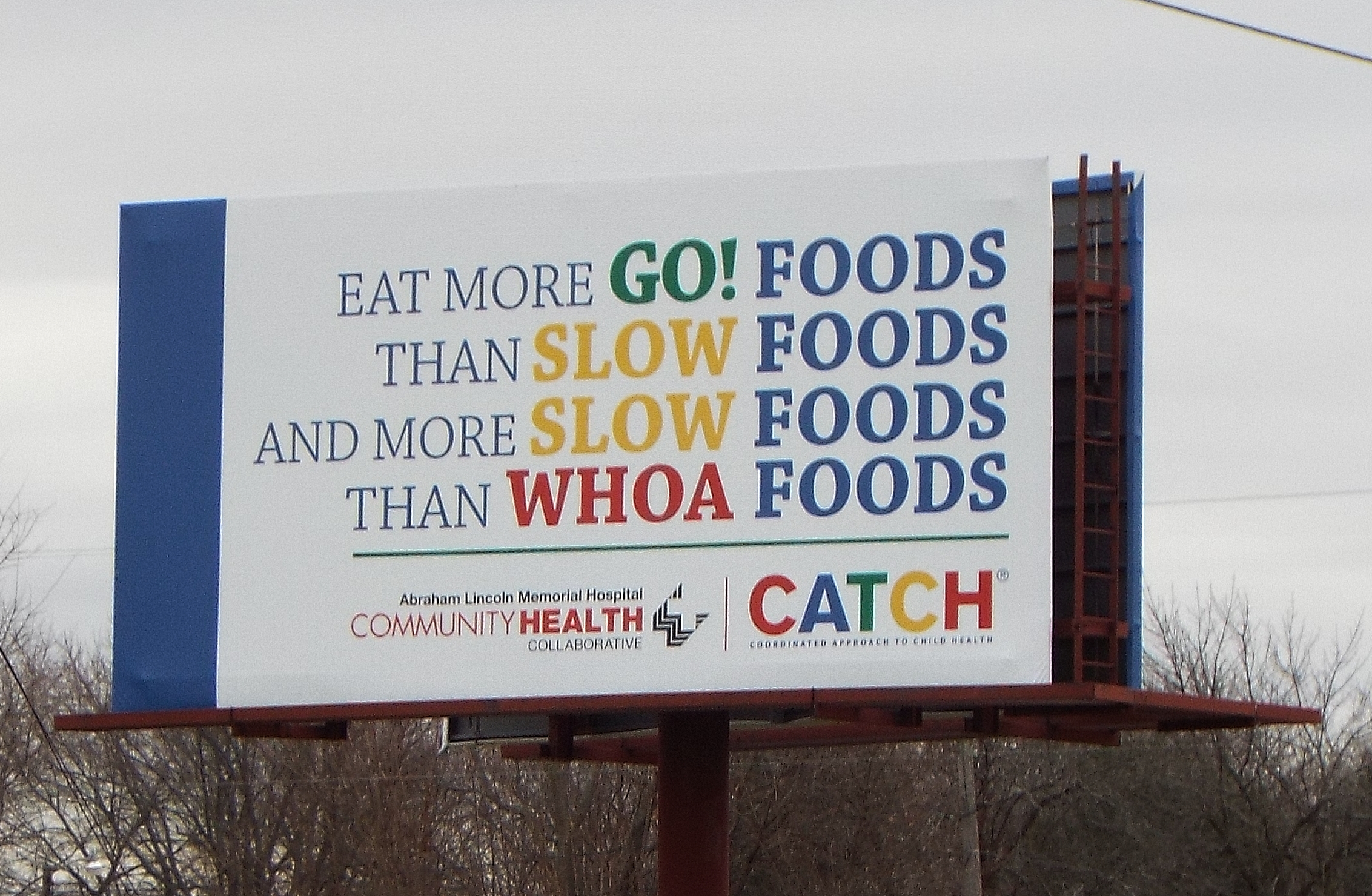 This color coded billboard located on the Logan County Fairgrounds illustrates the 'Go, Slow, Whoa Foods' montra used by the CATCH program to teach kids what foods to eat more often.