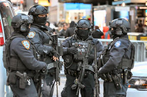 New York Police Department Counterterrorism Bureau members stand in
