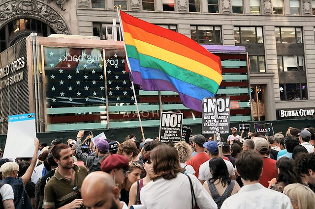 A rainbow flag flies as people protest U.S. President Donald Trump's