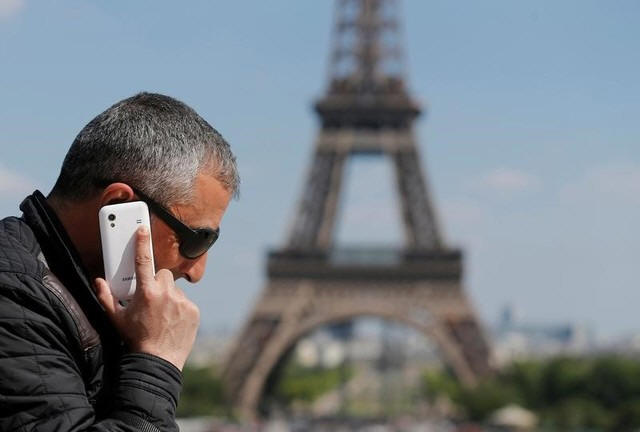 A man makes a phone call using his mobile phone at the Trocadero