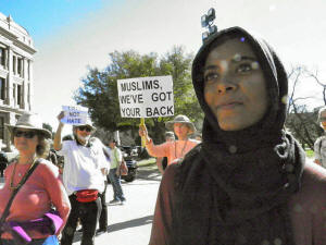 people waving signs reading, "Muslims, We've Got your Back."
