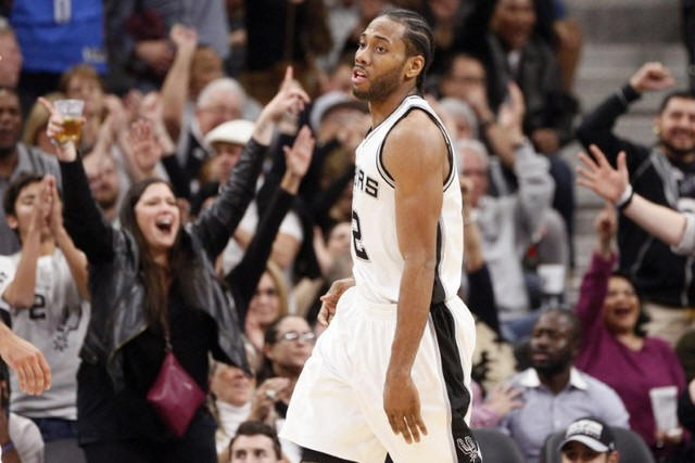 Spurs small forward Kawhi Leonard (2) reacts after a shot during the