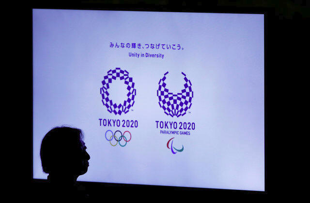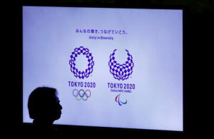 against a monitor showing Tokyo 2020 Olympics and Paralympics