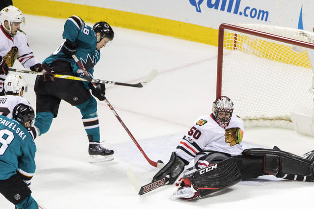 past Joe Thornton and behind prone Chicago goalie Corey Crawford