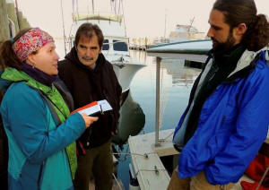 activists Ken Ward (C) and Jay O'Hara blockade a 40,000 ton shipment