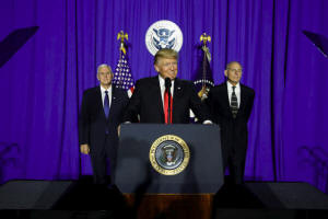 President Donald Trump (C), flanked by Vice President Mike Pence (L)