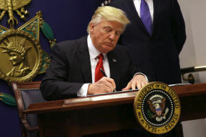 President Donald Trump signs an executive order to impose tighter