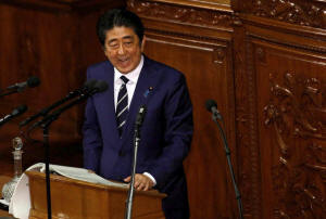 Japan's Prime Minister Shinzo Abe makes a policy speech at the start