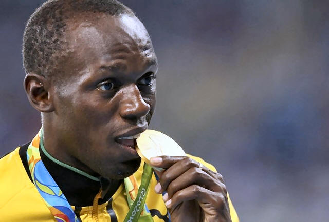 Gold medalist Usain Bolt (JAM) of Jamaica bites his medal.