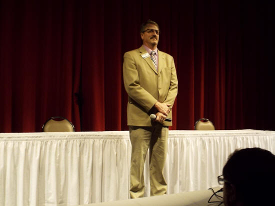 Dr. David Gerlach, President of Lincoln College, waits for the crowd to settle on Wednesday evening at the Lincoln Mayoral Candidate Forum. Before introducing the candidates, Gerlach spoke briefly about the connection between Lincoln College and the city, the return of the college to a four-year university, as it was when founded, and announced that the evening's activities were being recorded and televised by the college's new LCTV program.