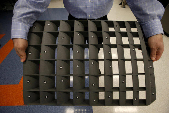 A technician displays a 3-D printed thrust reverser cascade printed