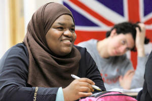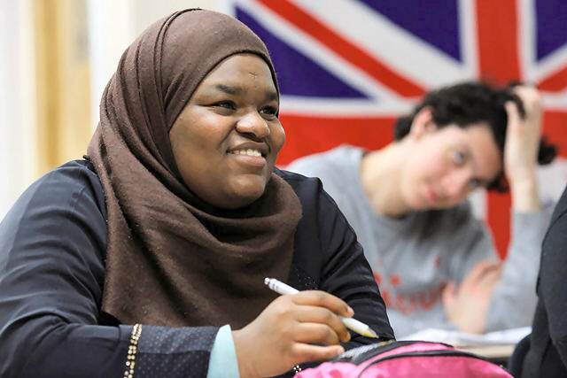 Tenth grade student Ayia Elsadig listens as Nadeem Mazen, Cambridge