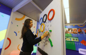 A hostess adjusts the Olympic rings at a promotional spot as the