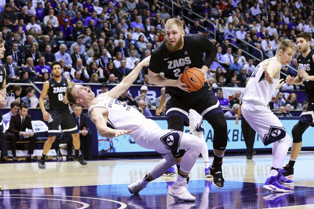 Gonzaga Bulldogs center Przemek Karnowski (24) knocks Brigham Young