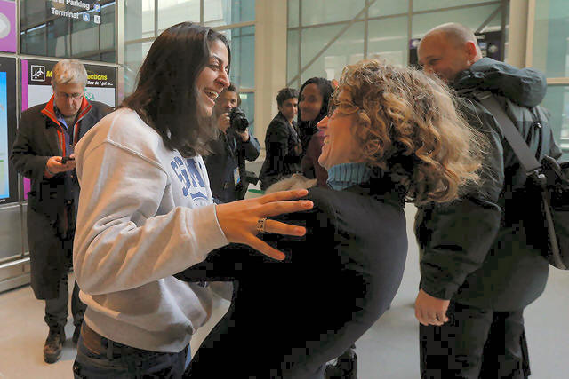 (MIT) from Iran, is greeted by immigration attorney Susan Church (R)